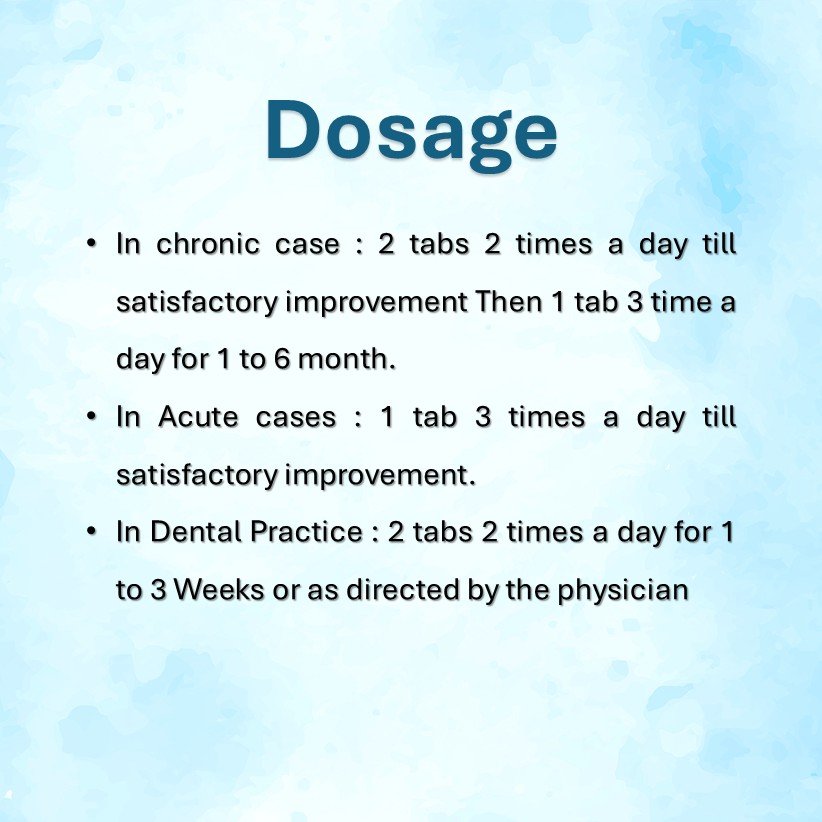 Dosage: Adults: 1 tab 3 times a day or as directed by the physician, Children: 1 tab 2 times a day of as directed by the physician